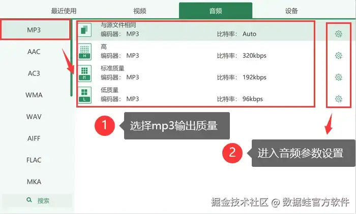 转mp3音频用什么软件?数据 蛙音频转换器是一款功能强大的音频处理软件,支持多种音频格式的转换,如MP3、WAV、AAC、FLAC、OGG等格式。支持格式的广泛性为用户提供了极大的灵活性,无论用户需要哪种格式的音频输出,都可以轻松实现。