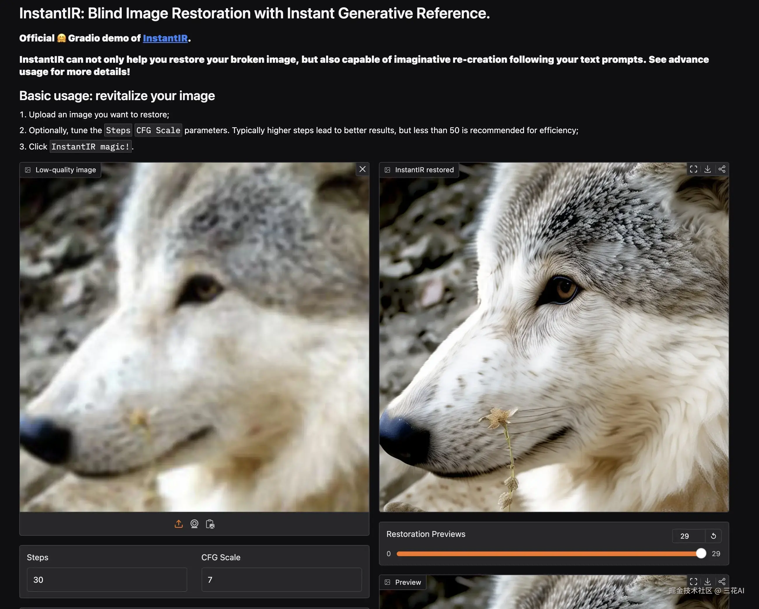 InstantIR[2]现在发布了在线演示[3],可以体验一下。这是基于 SDXL 的高清修复模型,效果远超同类超分辨率模型。