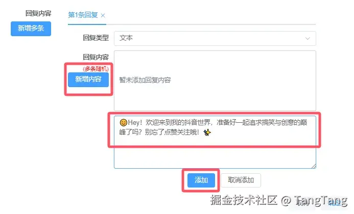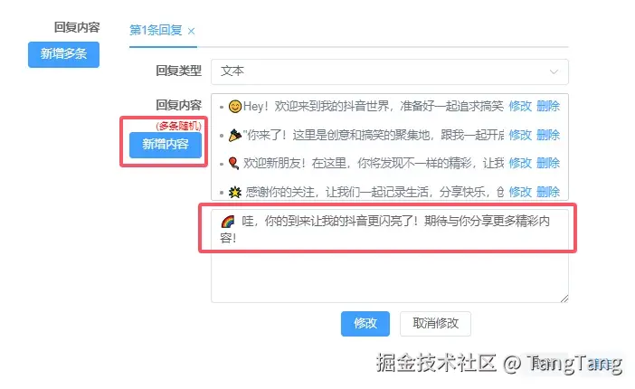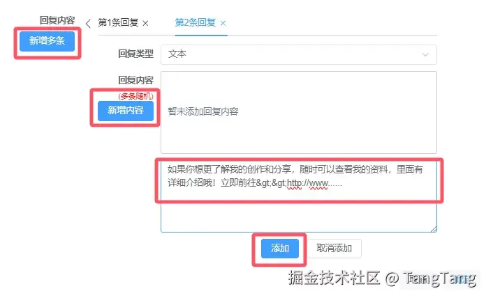 点击“新增多条”即可添加多条回复内容。使用时请合理控制自动回复的条数,更好保障用户体验。