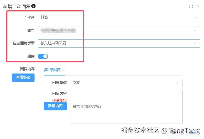 2.在新增页面,我们选择“抖音”平台及账号,自动回复类型选择“抖音被关注自动回复”,并打开“启用”。