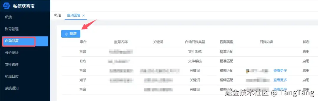 1.在「私信获客宝插件」平台的自动回复功能页面,我们点击“新增”。