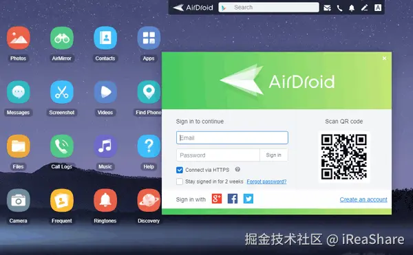 如果您打算无线传输某些特定文件,AirDroid Personal 可能是将 Android 手机备份到 PC 的最佳应用程序之一。借助这款出色的应用程序,您可以通过网络将 Android 联系人、消息、照片、音乐、通话记录、文件等传输到 PC。它还支持Android设备的远程控制,因此即使手机不在身边,您也可以将Android屏幕投射到计算机上并对其进行控制。