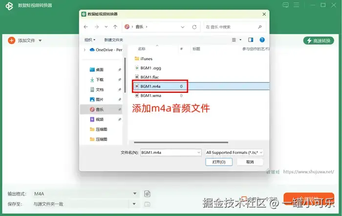 步骤1:打开数据 蛙视频转换器与电脑本地音频文件夹,将m4a音频文件添加到该应用的格式转换界面。