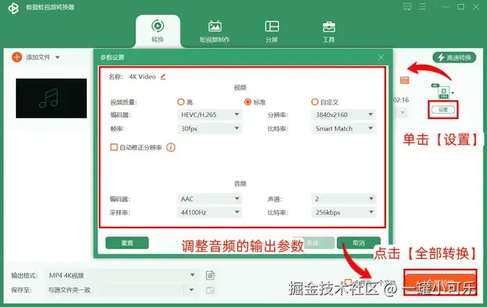 步骤3:在格式转换界面,单击【设置】功能,调整音频的输出参数,然后点击【全部转换】即可。
