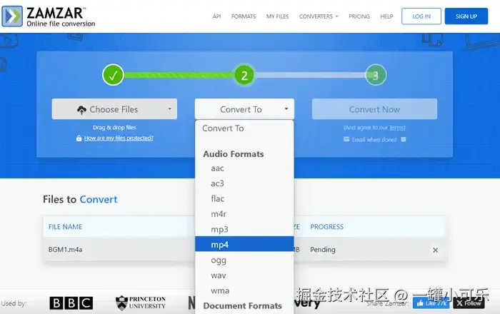 如果用户不想要花费时间成本的话,可以选择Zamzar在线音视频格式转换网站来将m4a换mp4。用户只需根据Zamzar的界面提示,执行三个步骤,即可完成音视频间的格式转换。但Zamzar是在线网站,存在一定的数据泄露风险,并且在下载转换后的mp4文件时,需要登录个人邮箱才能下载。