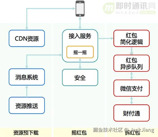 如上图所示,摇一摇红包系统架构包括三个方面: