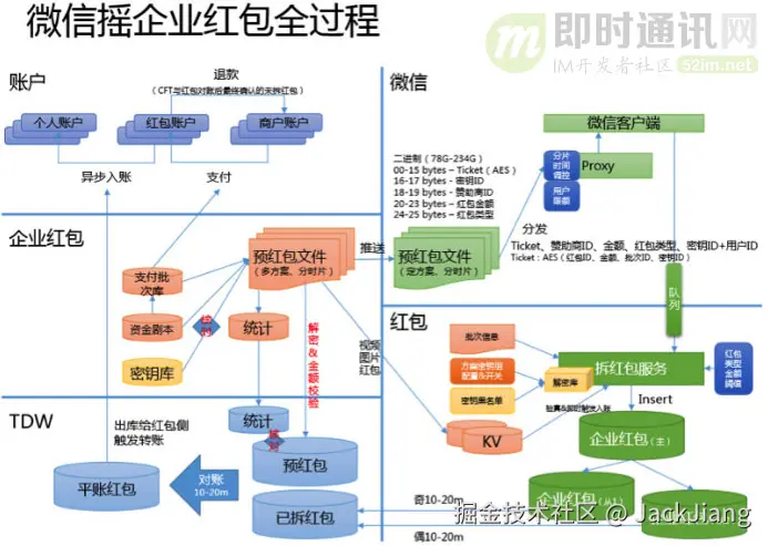 微信红包系统在春节除夕活动时和平时的实现不大一样。在除夕活动时,除了个人红包外,红包系统还要处理由后台通过摇一摇集中下发的大量企业红包。这里边信息流的实现变化较大。