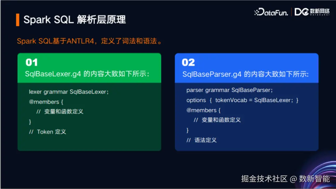 首先介绍词法分析,即左边绿色文件的主要内容。该文件包含一个members作用域,定义了很多在Parser代码中复用的变量和函数,此外文件还包含了一些Token定义(例如SELECT、FROM等关键字),在上图中已省略。其次介绍语法分析,即右边蓝色文件主要内容,内容中options引用了左边文件的词法分析的内容,members作用域定义了一些变量和函数,其中还包含了语法定义(如DQL、DEL、DML、Spark SQL自定义语法等等)。