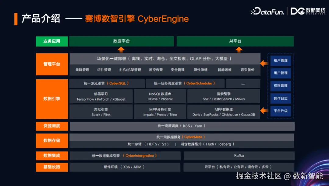 第一个是CyberEngine,也叫Cyber数智引擎。 Cyber数智引擎旨在构建一个基于云原生的数据湖底座,可以支持用户更好地去分析和挖掘数据,提升自身在市场和商业上的竞争力。Spark自从开源以来很快成为大数据领域的事实标准,CyberEngine支持对Spark SQL的管理。数新网络基于Spark SQL实现了统一的SQL查询平台,即CyberSQL。