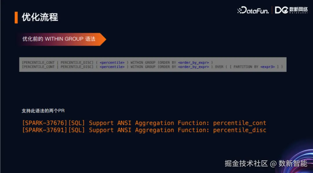 本人在Spark 3.2版本向社区陆续贡献了两个语法PR。最早是在语法定义模板里修改了部分定义实现相应功能,增加了percentile_cont和percentile_disc这两个函数作为聚合函数和窗口函数的一些功能。
