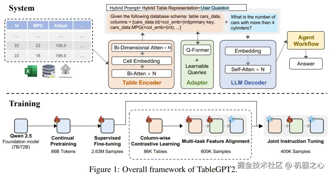 从名称也能看出,TableGPT2 是 TableGPT 的新一代版本。初始版本的 TableGPT 就已经引入了结构化特定领域语言(DSL)和专用表格编码器等方法,可以管理复杂的基于表格的查询。在此基础上,TableGPT2 实现了巨大的改进。他们不仅扩大了数据和训练协议的规模,还重新设计了每个组件,同时也引入了一些提升稳健性、扩大适用性以及优化商业智能应用性能的技术。