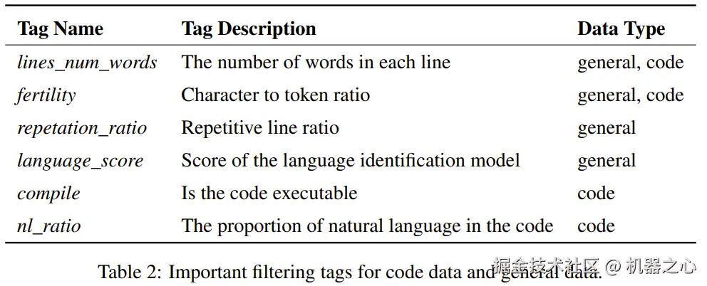 在文档层面,他们使用 54 个不同的类别对数据进行了标注,以确保全面覆盖不同的文档类型。下表展示了一些重要的过滤标签。