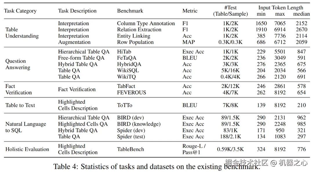 下表 4 汇总了现有的表格理解和推理基准,共涵盖了 27.7K 个表格和 88.9K 个测试样本。团队将这些基准划分为了以下 6 项主要的表格分析任务,以全方位评估模型在不同类型任务中的性能: