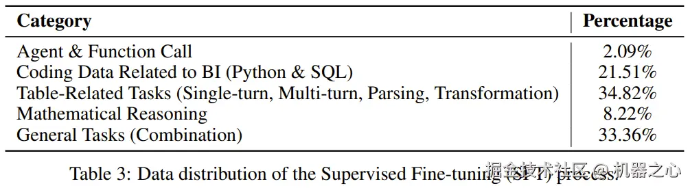 这个数据集的构建过程既包括人工标注,也包含一个专家驱动的自动化标注流程,从而可以保证数据的质量和相关性。总体而言,SFT 过程涉及 236 万个样本, token 数量达数十亿,足可用于进一步微调模型,使其满足商业智能和其他涉及表格的环境的特定需求。