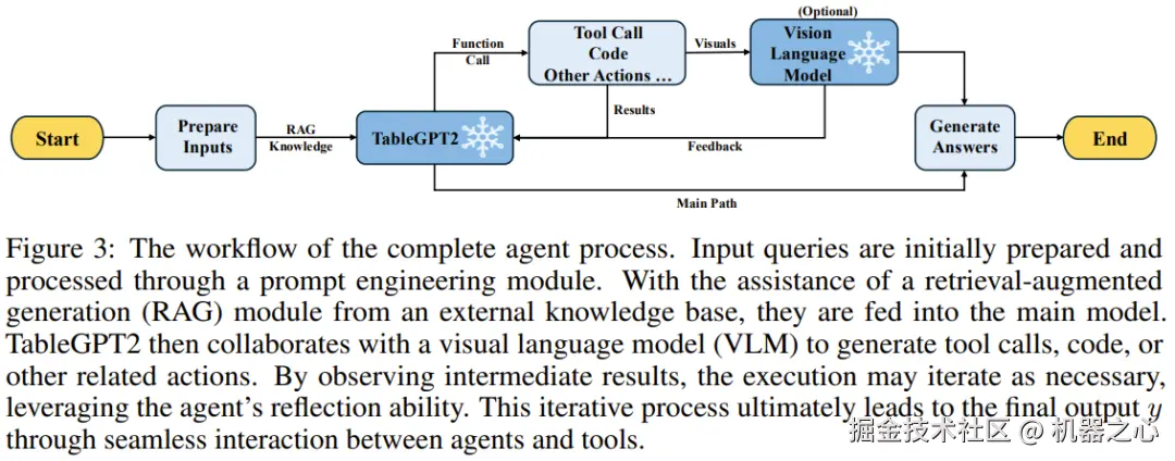 下图展示了智能体的完整工作流程:首先通过一个提示词工程模块来准备和处理输入查询。再基于一个外部知识库使用 RAG 模块后,将经过处理的输入送入主模型。然后,TableGPT2 会与一个视觉 - 语言模型(VLM)合作生成工具调用、代码等相关动作。通过观察中间结果,可以根据需求选择是否迭代,以利用该智能体的反思能力。通过智能体与工具之间的无缝交互,这个迭代过程最终可得到最终输出。