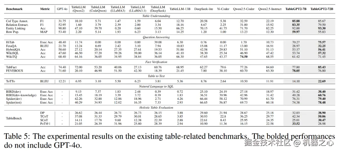 基于这一视角,依托 Qwen,他们研发了 TableGPT 系列模型。现如今,这个模型已经更新到了第 2 代,性能表现较之前代已有大幅提升:**在某些基准上,TableGPT2 能够媲美甚至优于 GPT-4o!**或者按团队负责人赵俊博博士的说法:「目前通用大模型在许多结构化数据相关的任务上的表现仍然较弱,TableGPT2 在相关任务的榜单上铁腕刷榜 —— 各类相关任务刷出去平均 40 个点。」