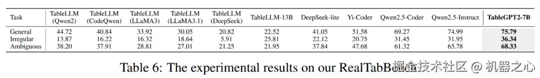 同样地,对于 RealTabBench 数据集,TableGPT2(7B)在多项任务上均达到了新 SOTA。