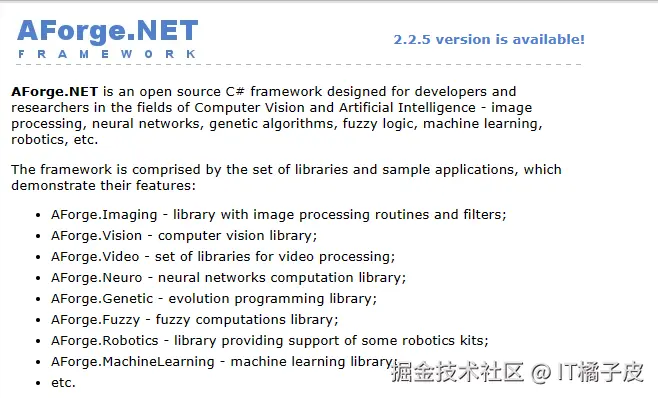 - AForge库提供了丰富的图像处理和视频处理算法、机器学习和神经网络模型,并且具有高效、易用、稳定的特点。