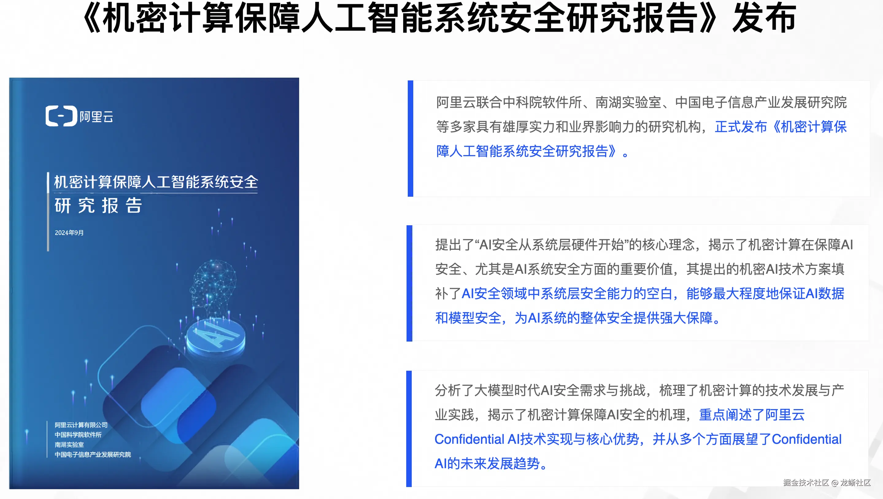 在合规领域,阿里云联合中科院软件所、南湖实验室、中国电子信息产业发展研究院等多家具有雄厚实力和业界影响力的研究机构,正式发布 《机密计算保障人工智能系统安全研究报告》 。