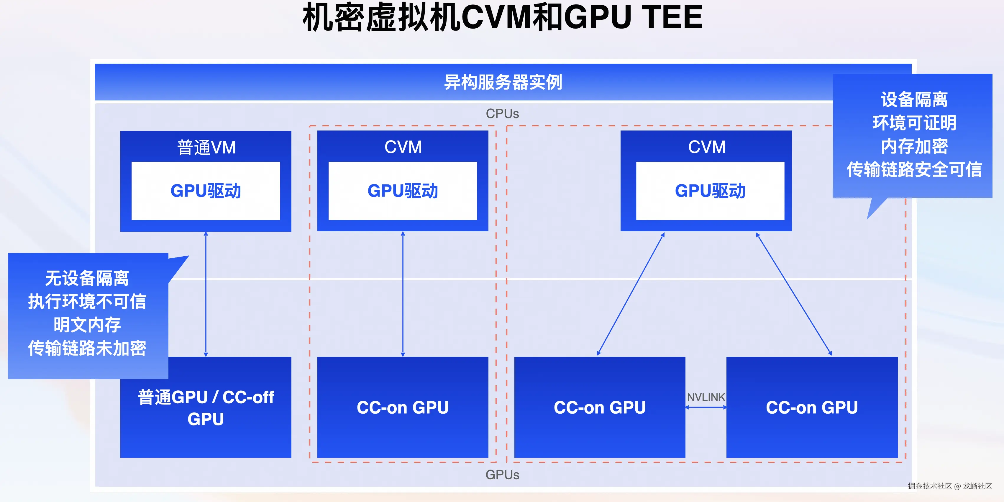 Confidential AI 使用异构 TEE 技术,在确保 CPU 执行环境安全可信的同时,还能够验证 GPU TEE 并与之在物理总线之上建立端到端的安全信道,确保 CPU-GPU 之间的数据机密性和完整性。