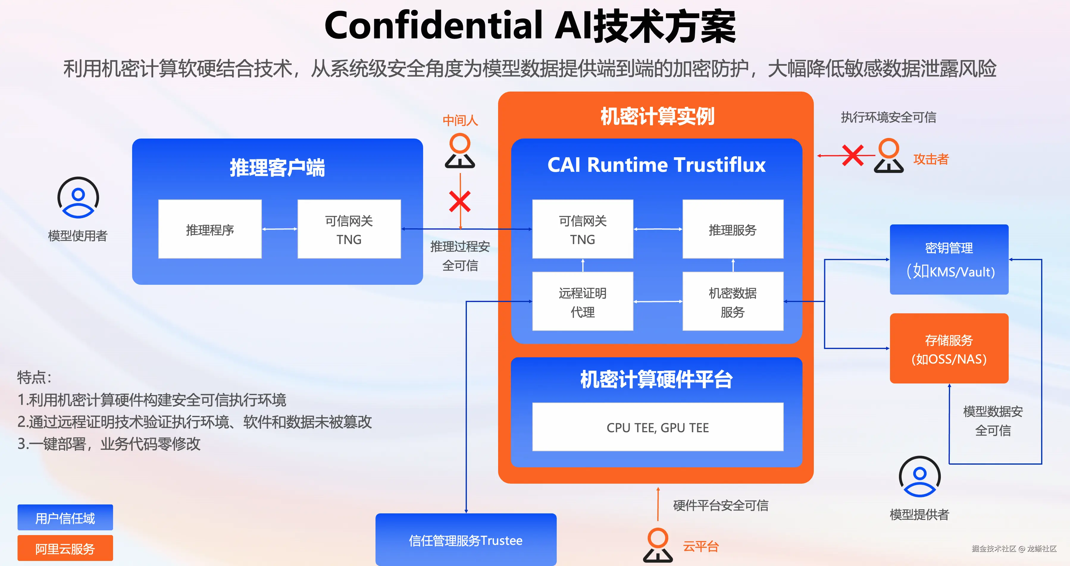 为了有效解决上述典型数据安全问题,阿里云全面应用 Confidential AI,利用机密计算软硬结合技术,从系统级安全角度为模型数据提供端到端的加密防护,大幅降低敏感数据和模型的泄露风险。
