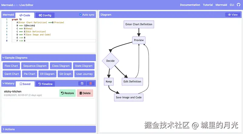 它允许用户在浏览器或markdown文件中以动态方式可视化地创建流程图、序列图和类等。