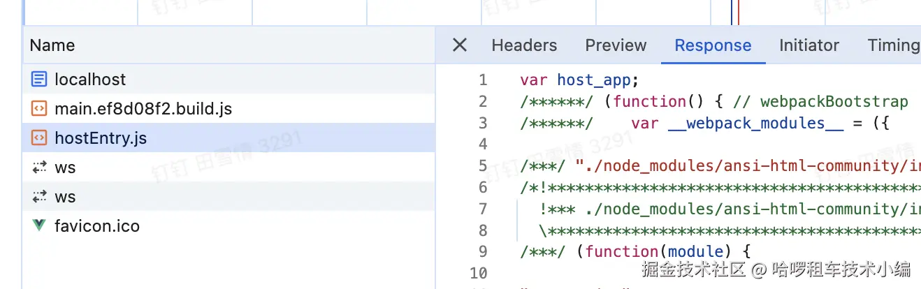 4. 重新运行host 项目 npm run dev, 会看到页面请求了 hostEntry.js 这个文件 5. 里面声明了一个 aaa_app 的变量。这就是说 webpack 把这个组件的代码分离到了这个文件里。这样别的 webpack 应用就可以直接用这个组件了。