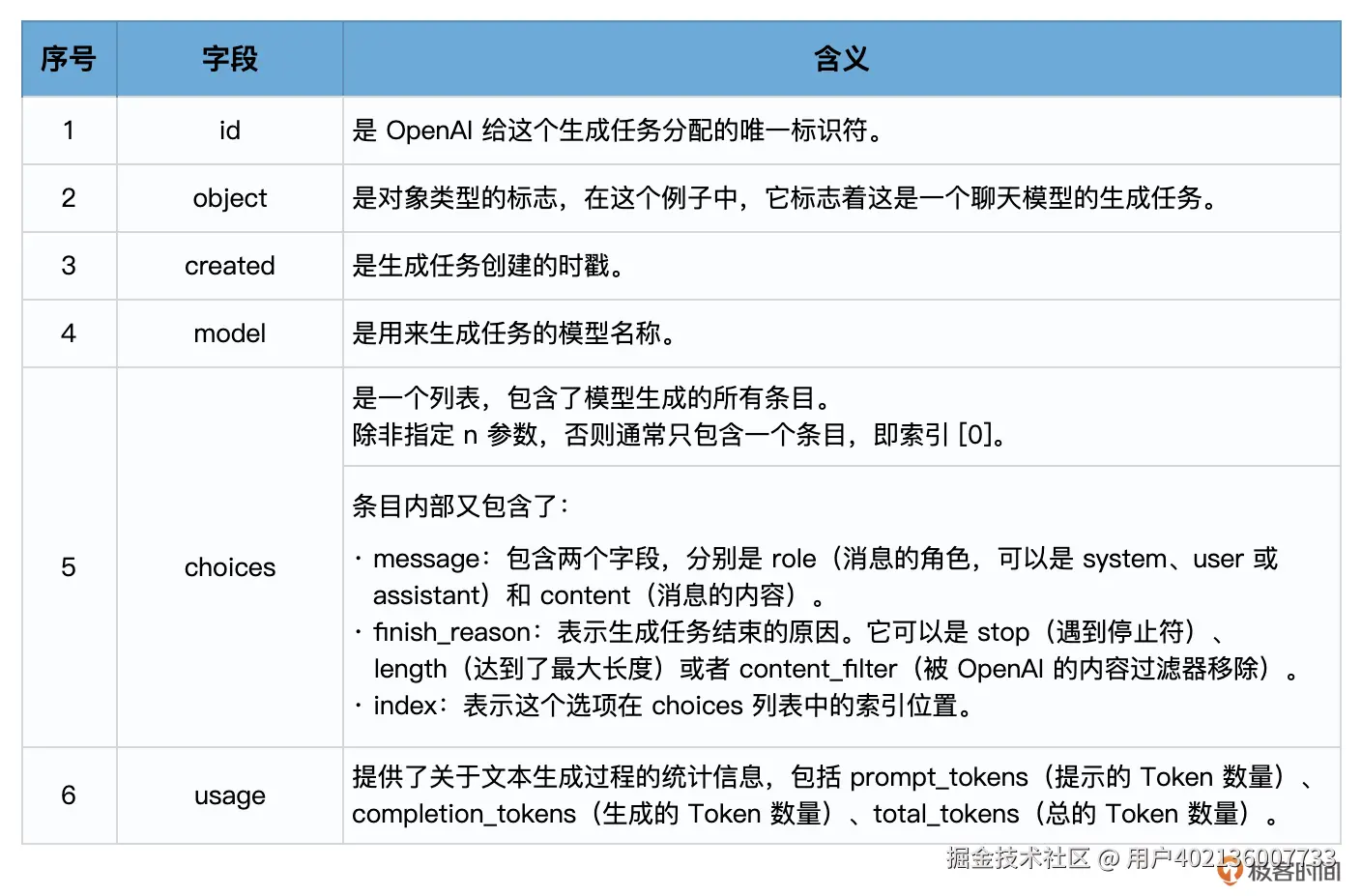 - finish_reason:模型停止生成的原因,可能的值包括 stop(遇到了停止标记)、length(达到了最大长度)或 temperature(根据设定的温度参数决定停止)。