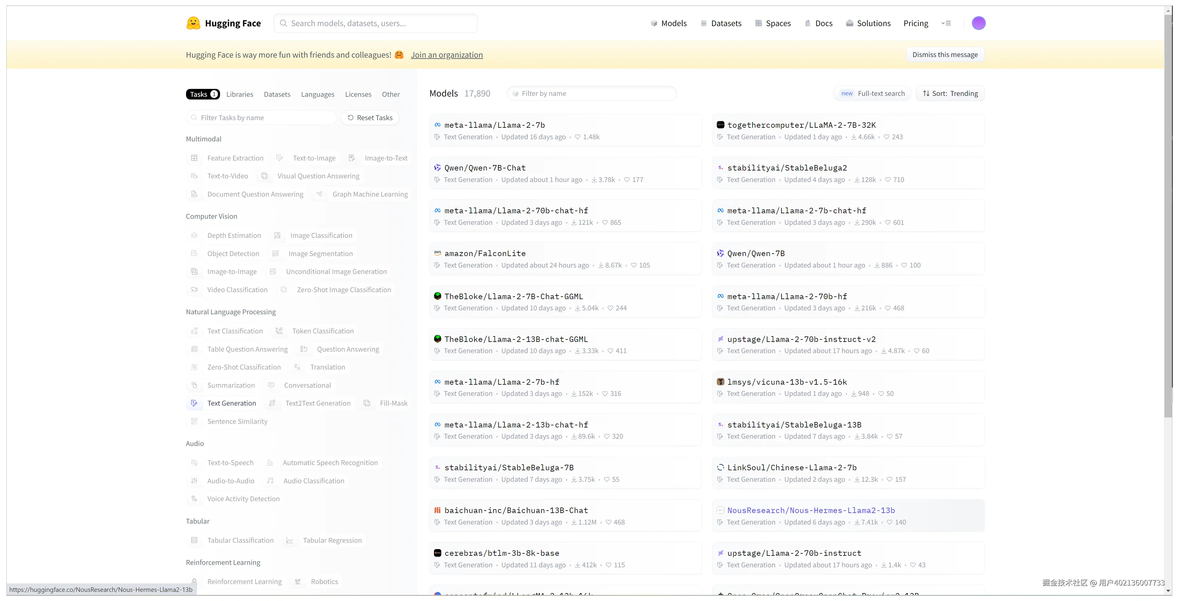 另外,大语言模型可不是OpenAI一家独大,知名的大模型开源社群HugginFace网站上面提供了很多开源模型供你尝试使用。就在我写这节课的时候,Meta的Llama-2最受热捧,而且通义千问(Qwen)则刚刚开源。这些趋势,你点击下面的图片就看得到。