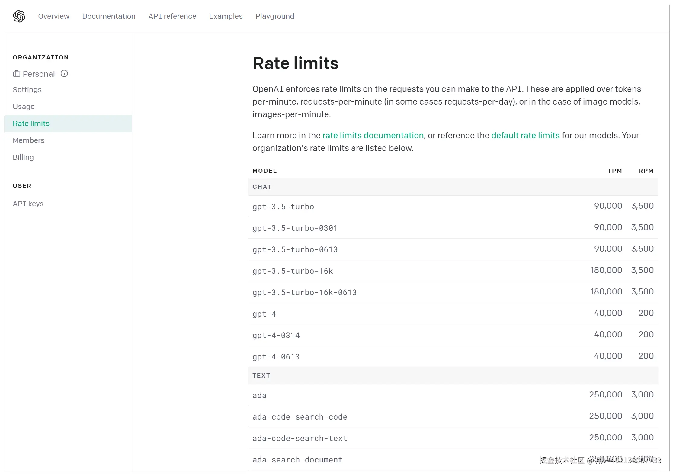 有了OpenAI的账号和Key,你就可以在面板中看到各种信息,比如模型的费用、使用情况等。下面的图片显示了各种模型的访问数量限制信息。其中,TPM和RPM分别代表tokens-per-minute、requests-per-minute。也就是说,对于GPT-4,你通过API最多每分钟调用200次、传输40000个字节。