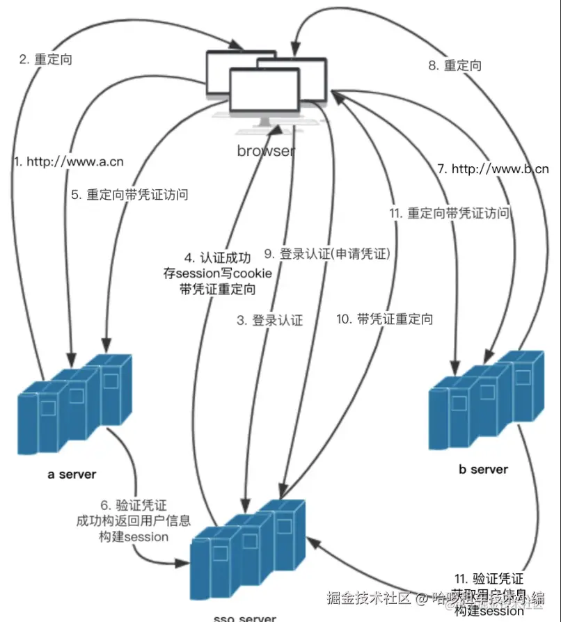 - 之后当用户访问 a 或者 b 后,直接会携带 a cookie/b cookie,就不用再向 SSO 确认了。