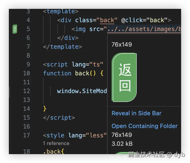 当你的代码中用到图片的静态路径时,悬浮在路径上可展示图片的图像和尺寸,方便设置图片宽高