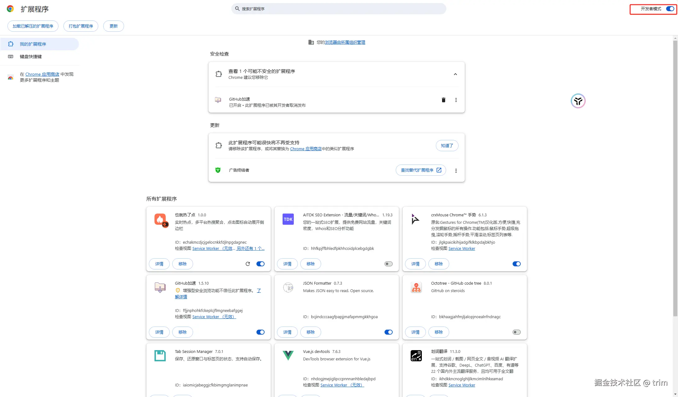 - 打开谷歌扩展管理的开发者模式,将zip文件拖入: