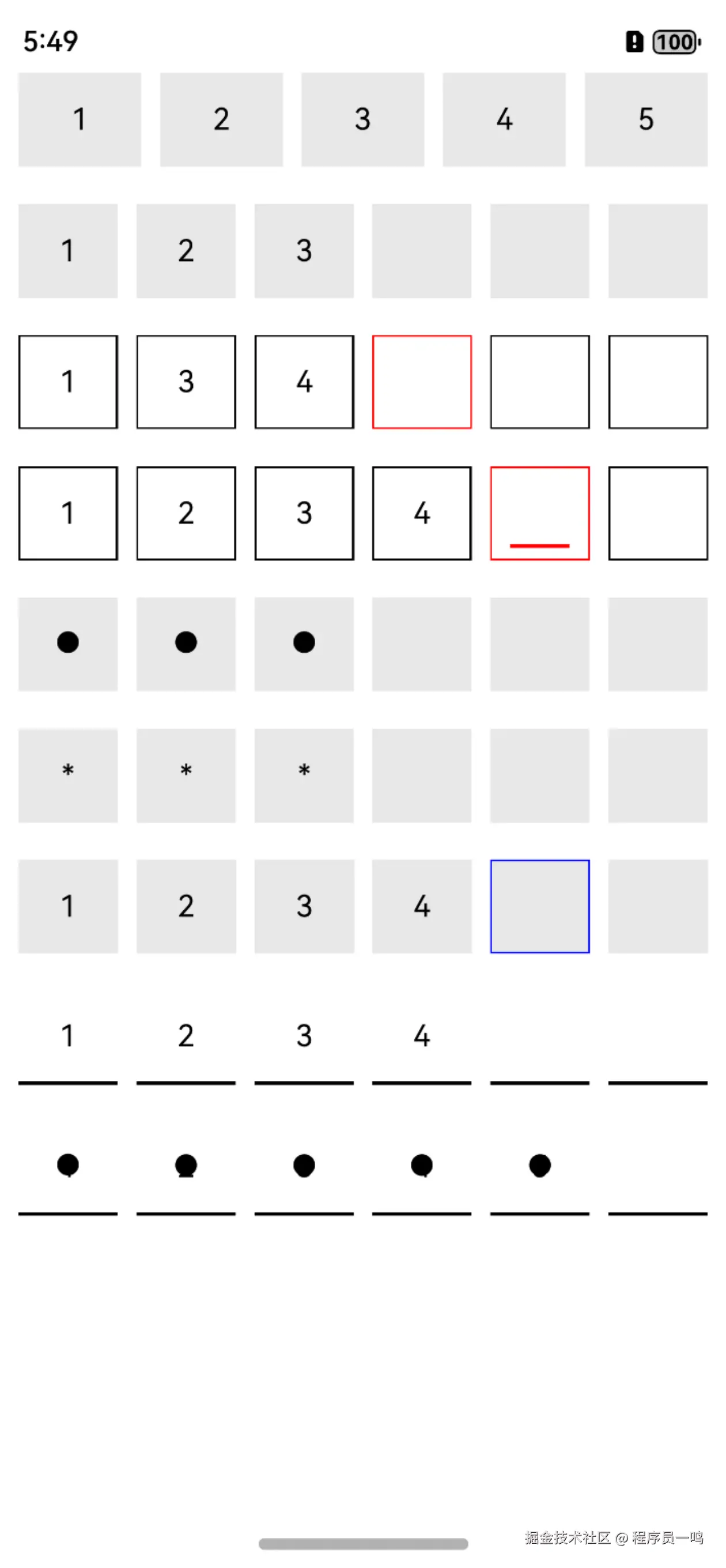 输入框没什么好说的,就是使用的TextInput组件,实际的场景中,其输入框的数量肯定是动态的,所以这里使用的是Grid组件展示一行,使用Grid的一个便利之处,除了均分简单配置列之外,还有一点,是方便控制列与列之间的距离;当然了使用其他的组件也没问题的。