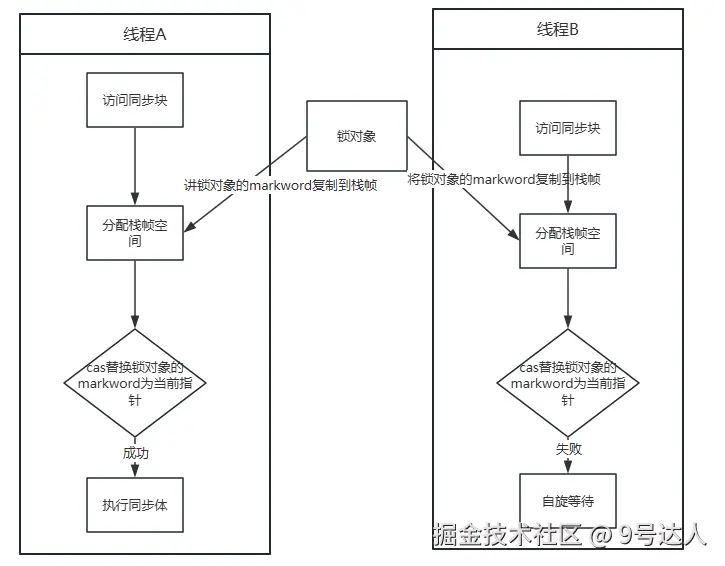当另一个线程竞争这个锁是,偏向锁状态则立即结束,转为轻量锁。因为是轻量级锁,所以是采用cas的方式进行加锁,加锁的流程也比较简单,就是将jvm会在当前线程的栈帧中,创建一个锁记录的空间,用于记录锁对象的markword拷贝值,然后通过cas的方式,将锁对象的markword值,替换为当前线程锁空间的地址。如果成功了,则该线程就拥有了这个锁。解锁的流程也是类似,也是通过cas的方式,尝试将锁空间的值,写回到锁对象中,如果成功则释放锁,如果失败,则表示有别的线程在竞争锁对象,则释放锁的同时,唤醒处于忙等状态的线程。