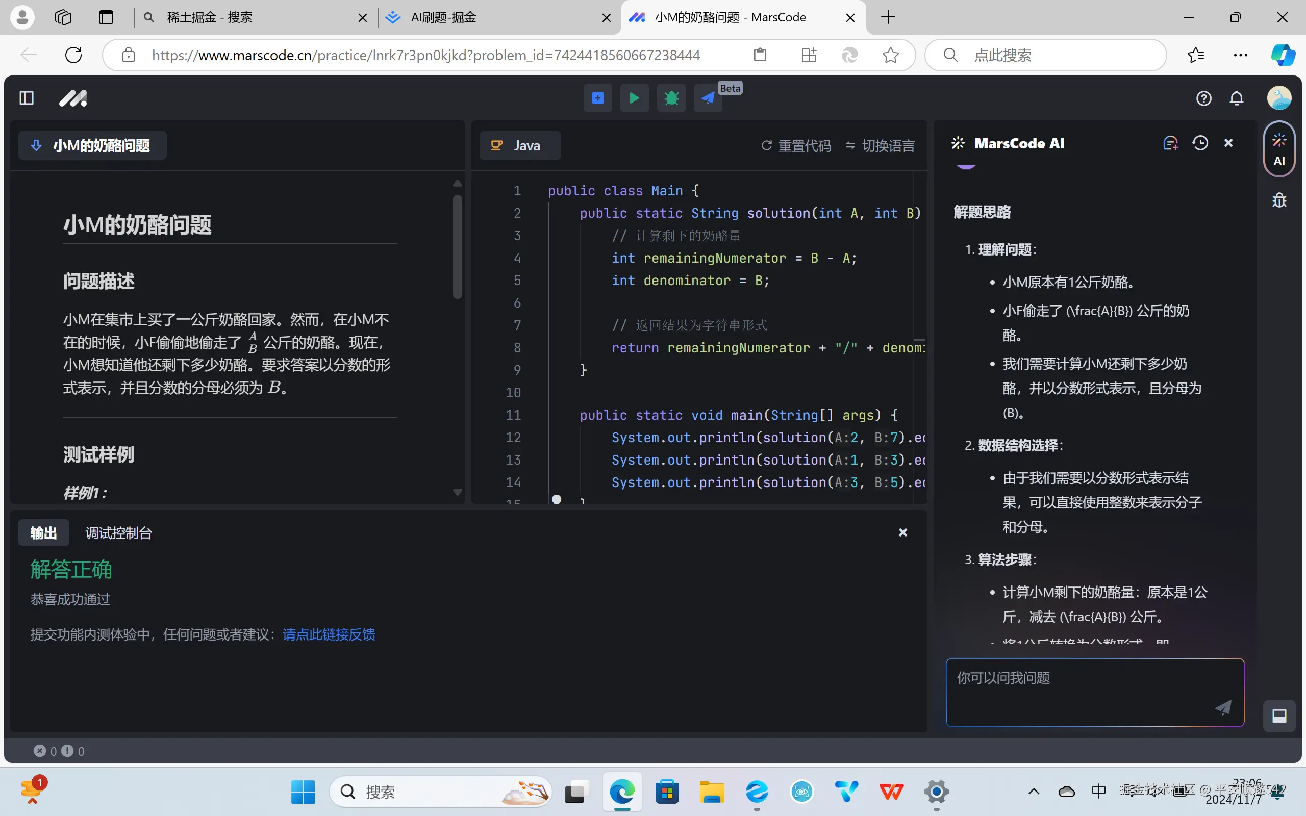 本次学习中,我深深感受到了编程带来的挑战与乐趣。小M的奶酪问题作为一个具体的编程实例,不仅考验了我们的编程技能,还锻炼了我们的逻辑思维和问题解决能力。 首先,这个问题让我意识到,编程不仅仅是编写代码,更重要的是理解问题的本质。在阅读问题描述时,我逐渐明确了问题的目标,即计算小M在奶酪被偷后还剩下多少,并以分数形式表示。这个过程中,我学会了如何从复杂的问题中提取关键信息,并将其转化为可编程的逻辑。 其次,编写代码时,我注意到了代码中的一些小细节,比如变量的命名、注释的添加等。这些看似微不足道的细节,实则在编程中起着至关重要的作用。它们不仅让代码更加易于理解,还方便了我后续的调试和维护。 在解决这个问题的过程中,我还遇到了一些挑战。比如,在计算剩下的奶酪量时,我需要确保分母始终为B,这在编写代码时需要特别小心。此外,我还需要处理一些边界情况,比如当A或B为0或负数时,程序应该如何处理。这些挑战让我更加深入地理解了编程的复杂性和多样性。 通过解决这个问题,我不仅掌握了Java语言的基本语法和常用数据结构,还学会了如何运用所学知识解决实际问题。更重要的是,这个过程锻炼了我的逻辑思维和问题解决能力,让我在面对类似问题时能够更加从容不迫。 总的来说,这次编程练习让我受益匪浅。它不仅提高了我的编程技能,还让我更加热爱编程这项充满挑战和乐趣的活动。我相信,在未来的学习和工作中,我会继续运用所学知识,不断探索和创新,为成为一名优秀的程序员而不懈努力。