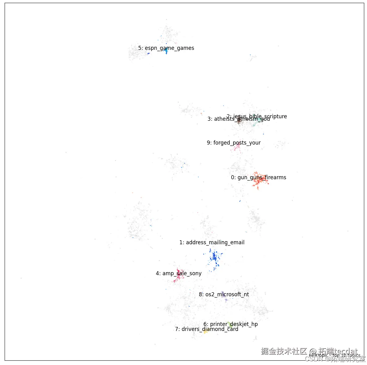 在上述代码中,我们首先设置了一些绘图参数,如要展示的主题数量top_n和字体大小fontsize。然后对数据进行切片处理,将不属于前top_n个主题的数据标记为 outliers(异常值),其余为 non_outliers(非异常值)。接着,我们定义了一个颜色映射cmap用于为不同主题的数据点分配不同颜色。通过matplotlib的scatter函数分别绘制异常值和非异常值的数据点,并根据主题进行颜色区分。最后,我们计算每个主题的中心点坐标,并在图上添加主题名称标注。