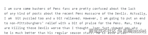 可以了解到数据集中文本的大致格式和内容范围。例如,docs[0]展示了关于 “Pens fans reactions” 的相关讨论内容,而docs[44]则包含了 “NHL ALLTIME SCORING LEADERS” 等详细的体育赛事相关信息。这些示例文本反映了数据集涵盖的丰富主题领域,为后续的主题建模分析提供了基础。
