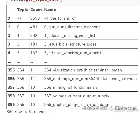 可以获取更详细的主题信息,包括每个主题的编号、出现次数以及根据主题内高频词汇生成的主题名称,例如部分结果如下: