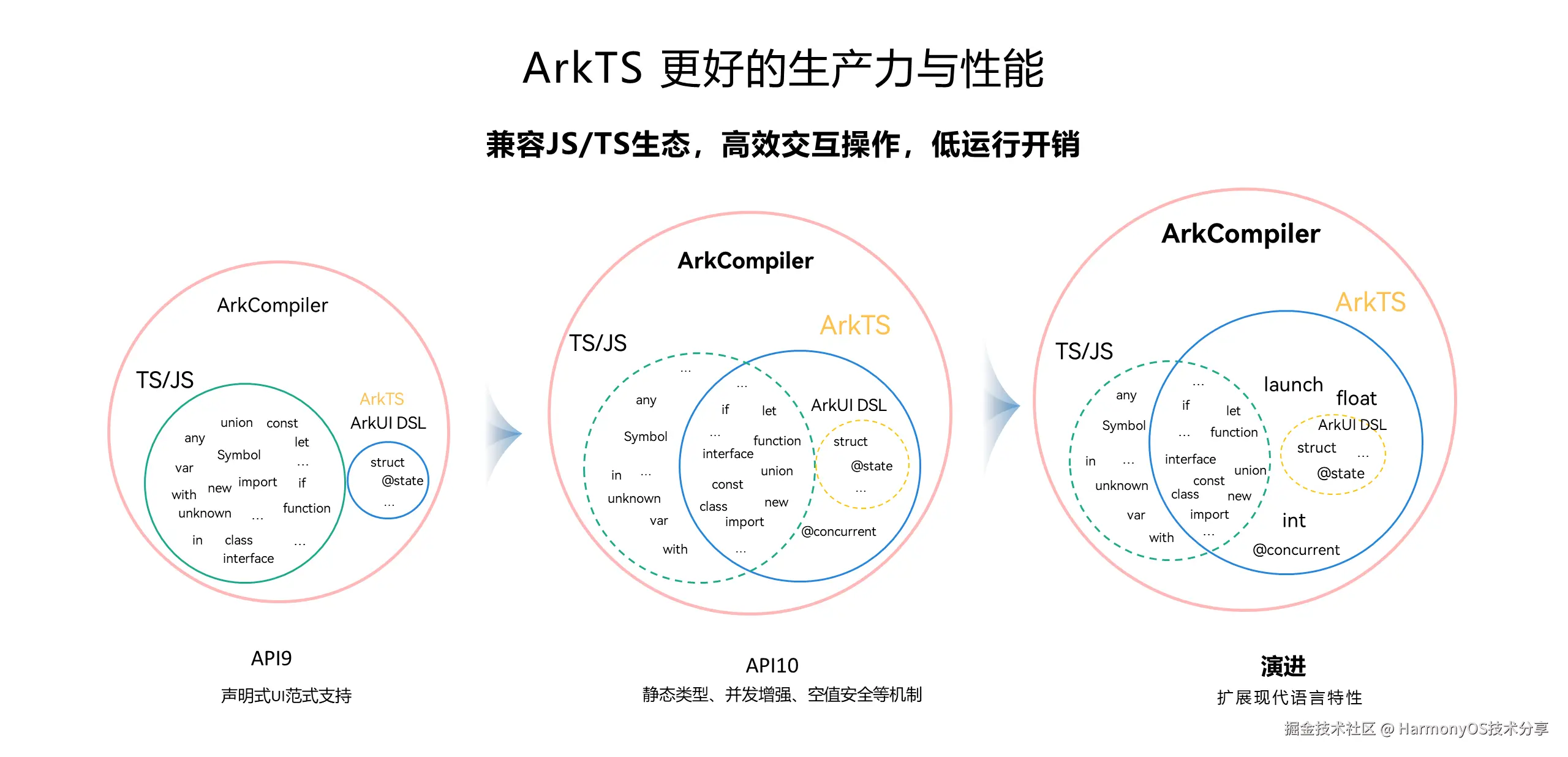 - ArkTS支持与标准JS/TS的高效互操作,兼容JS/TS生态。HarmonyOS也提供了标准JS/TS的执行环境支持,在“更注重已有生态直接复用”的场景下,开发者可以选择使用标准JS/TS进行代码复用或开发,更方便兼容现有生态。