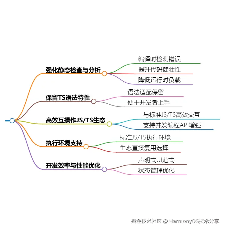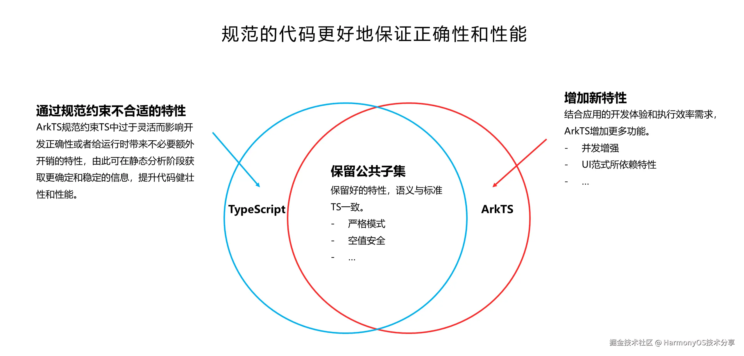 - 为更好地支持HarmonyOS应用的开发和运行,从Harmony OS NEXT Developer Preview 0版本开始,ArkTS在TS的基础上,进一步通过规范强化静态检查和分析,这样做有两个好处:许多错误在编译时可以被检测出来,不用等到运行时,这大大降低了代码运行错误的风险,有利于程序的健壮性;2.减少运行时的类型检查,从而降低了运行时负载,有助于提升执行性能。