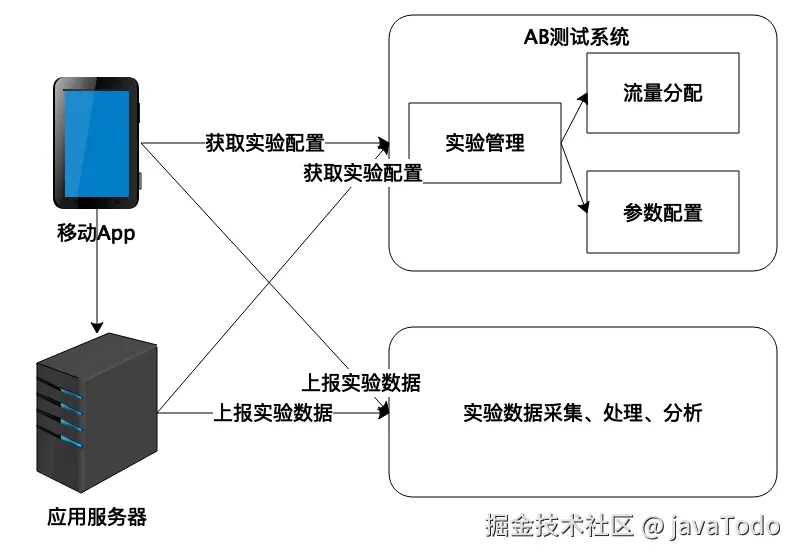 移动App和应用服务器上报实验数据其实就是传统的数据采集,但是在有A/B测试的情况下,数据采集上报的时候需要将A/B测试实验ID和分组ID也上报,然后在数据分析时,才能够将同一个实验的不同分组数据分别统计,得到A/B测试的实验数据报告。