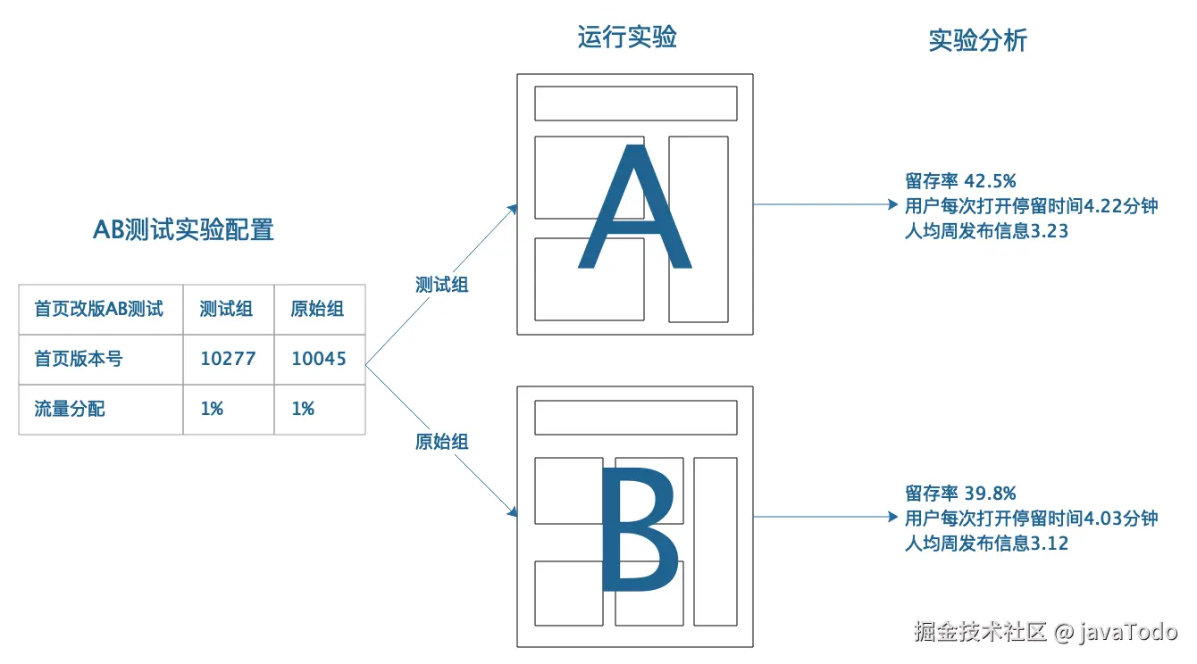 A/B测试可理解成在原来的打点基础上增加了实验ID、分组ID,数据存储和结构跟原来一样,SQL统计的时候根据ID分别统计,就得到各个实验分组的PV转化率这些指标。