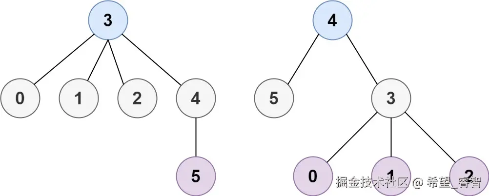 输入:n = 6, edges = [[3, 0], [3, 1], [3, 2], [3, 4], [5, 4]]