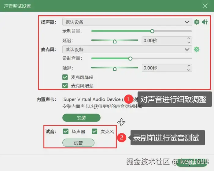 3、音频设置: 可以单独录制系统声音、麦克风声音,或两者同时录制。支持音频降噪、增益等调节,确保音质清晰。