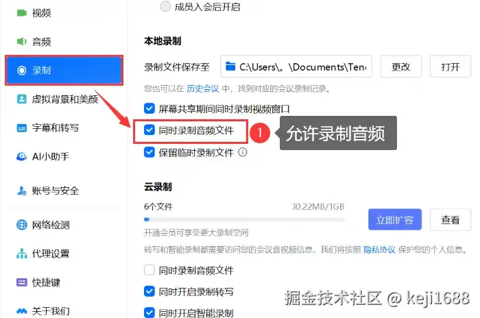 步骤1:打开腾讯会议,在录制前,确保勾选 【同时录制音频文件】 选项,以录制会议中的声音。