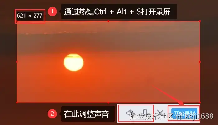 步骤2:用鼠标选择需要录制的屏幕区域,并开启需要录制的声音选项,点击 【开始录制】 按钮,录制过程中就可以同步录制声音。