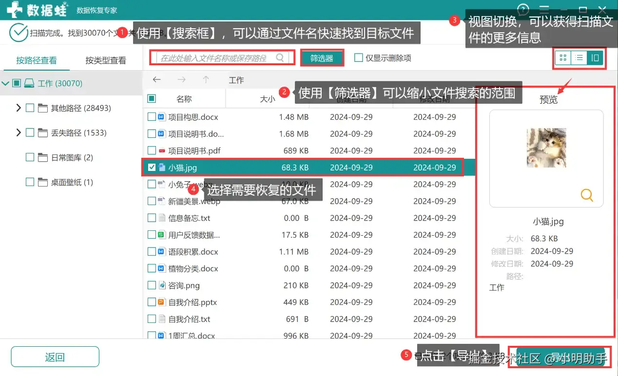 步骤2:等到显示扫描结果后,用户可以根据自己的需求去选择工具辅助自己进行目标文件的搜索。选择需恢复的文件后,点击【导出】。
