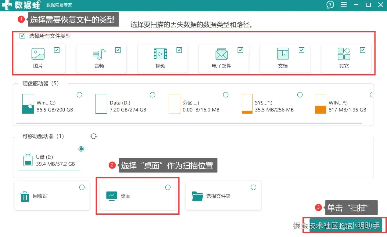 第1步: 打开数据 蛙恢复专家,然后在软件的主页面上勾选自己需要恢复的文件类型,再勾选上桌面作为扫描对象,最后才点击“扫描”。