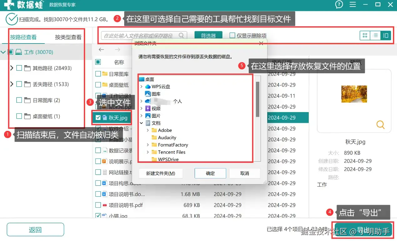 第2步: 在软件完成扫描后,选择自己需要恢复的文件后点击“导出”,最后在“浏览文件夹”中选择自己恢复文件的新存储位置。